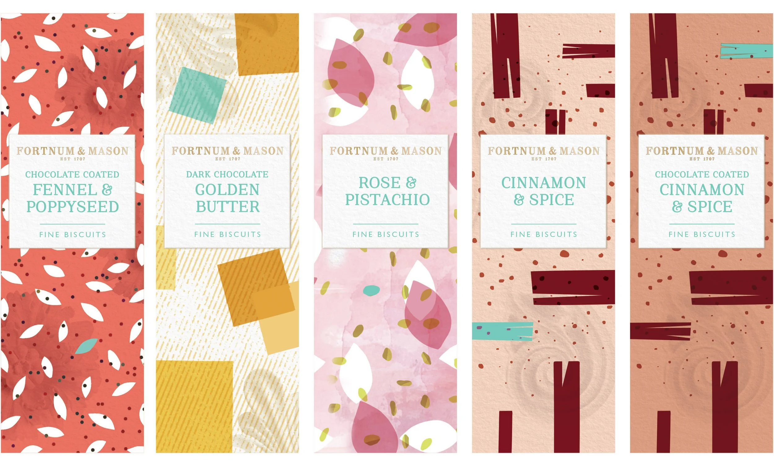 We were commissioned by Design Bridge to work on a range of patterns for a premium range of biscuits by famous London food store, Fortnum & Mason.